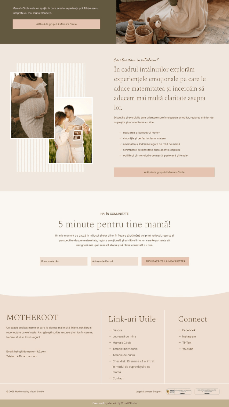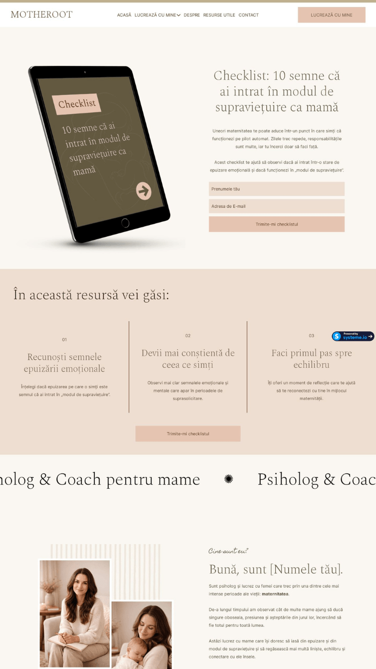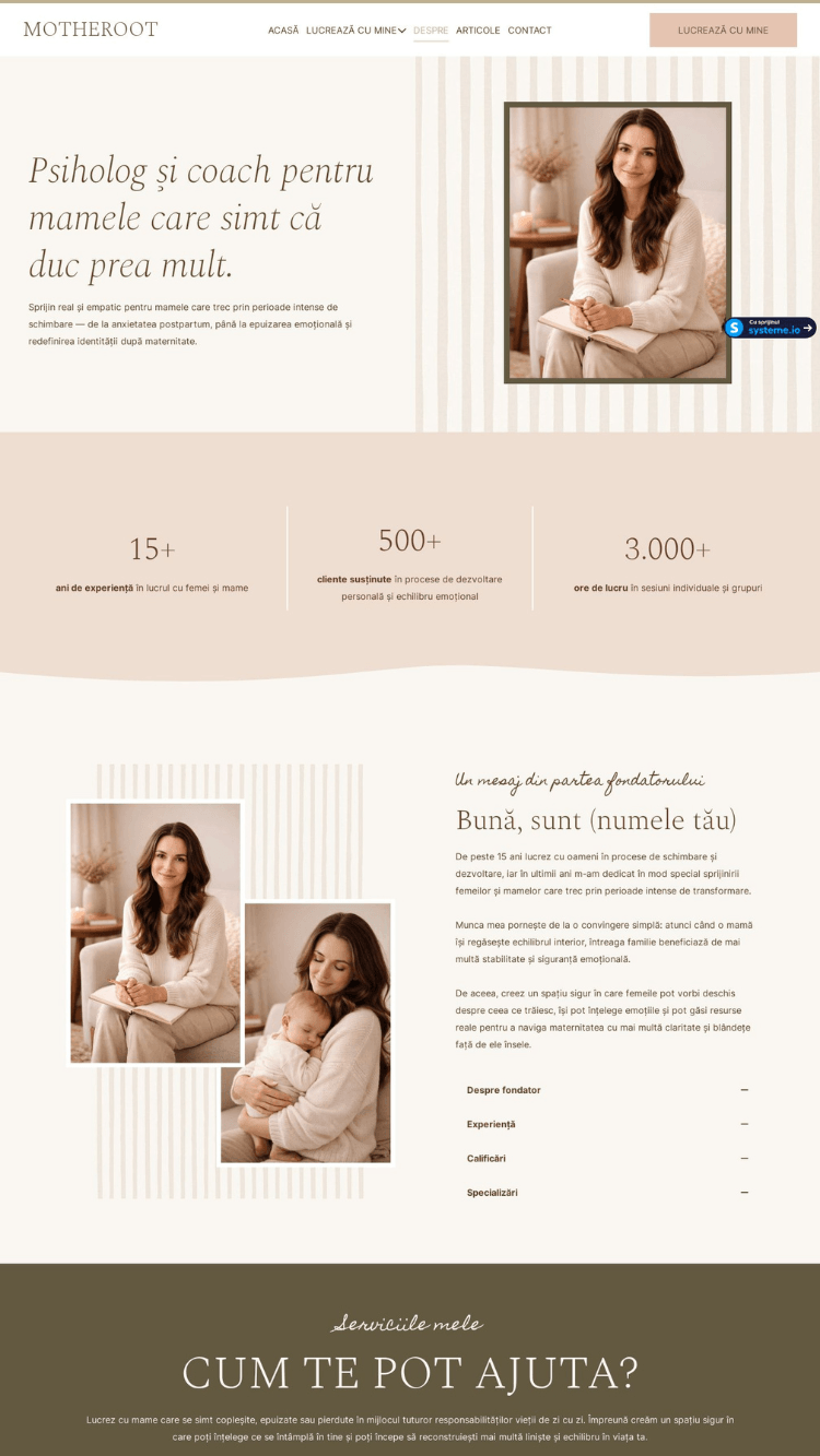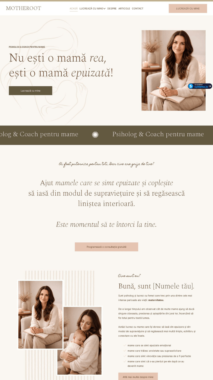 Template-ul Motheroot este creat pentru psihologi, terapeuți, coachi și profesioniști care lucrează cu mame și familii și își doresc un website modern, cald și profesionist.