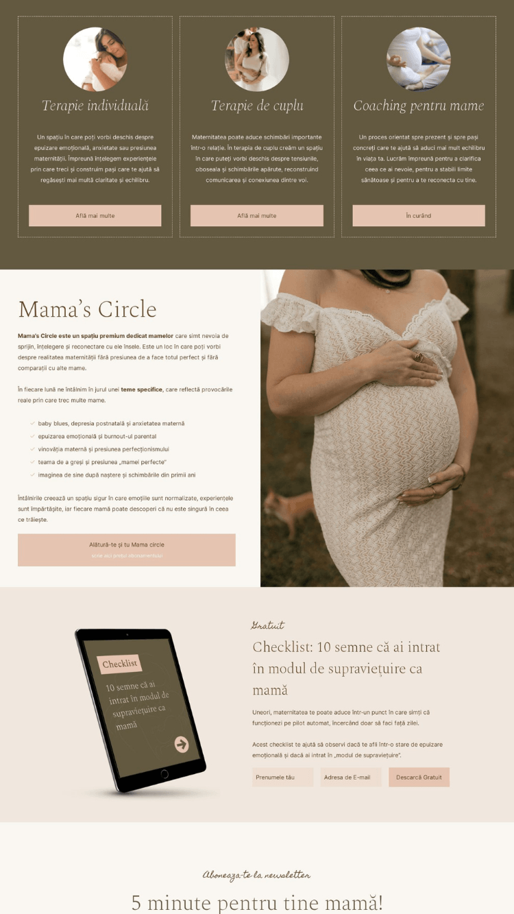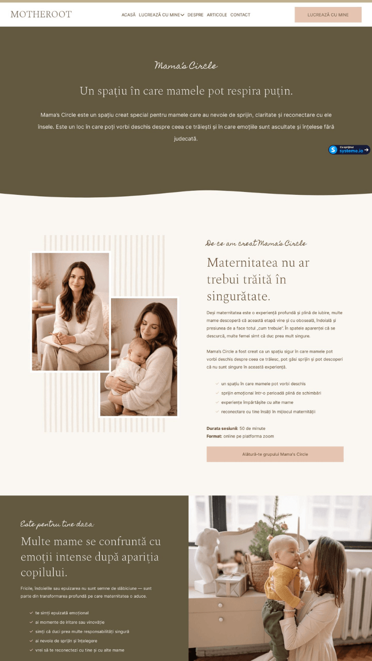 Am creat acest template pentru profesioniștii care lucrează cu mame — psihologi, terapeuți și coachi — și își doresc un website care să reflecte cu adevărat sensibilitatea și complexitatea maternității.